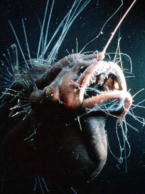 If it does find a female, it bites into her with its strong beak-like jaws and never lets go. Eventually, the circulatory system of the male and female merges, and the male's body atrophies and dissolves - leaving only a large pair of testicles attached to the female. In some species, the female will accept only one male, in others, she'll accept up to eight! All we can say is, it takes balls to be an anglerfish mother!