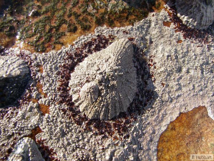 Early in their lives, pear limpets will clear a small area of rock for themselves - an area known as a scar. They will push all other animals out of this scar, and will clear it of all algae - except one species of coralline red algae (Spongites endoi). The limpets will slowly rotate within these scars, carefully eating off the upper layers of red algae, and allowing the bottom layers to survive so that these algae gardens can always regrow.