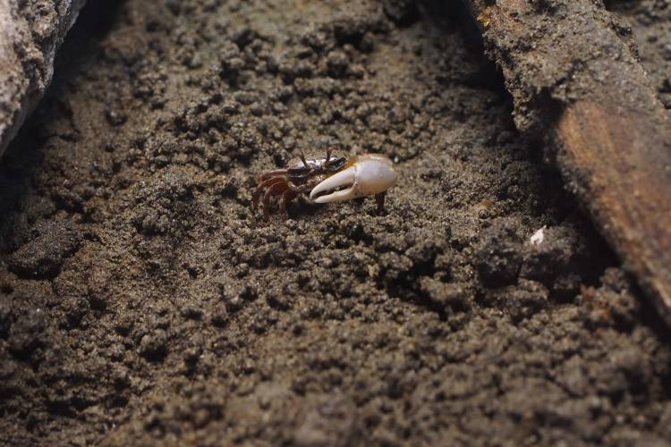 Possibly unique among crustaceans, milky fiddler crabs appear to use environmental cues to predict bad weather and high tides - using this sense of impending moisture to prepare for the worst. One study found that when poor conditions are approaching, females will save a portion of any carrion they find for later consumption, if there is more organic matter in the sediment than usual, they will push this sediment into their burrows for later sifting. This strategy appears to help females stay large and able to grow eggs even in poor conditions.