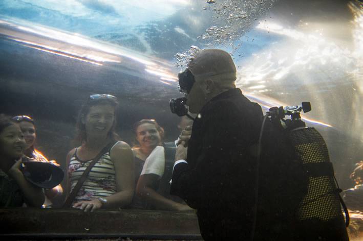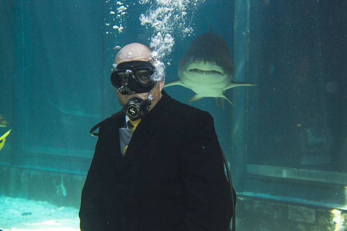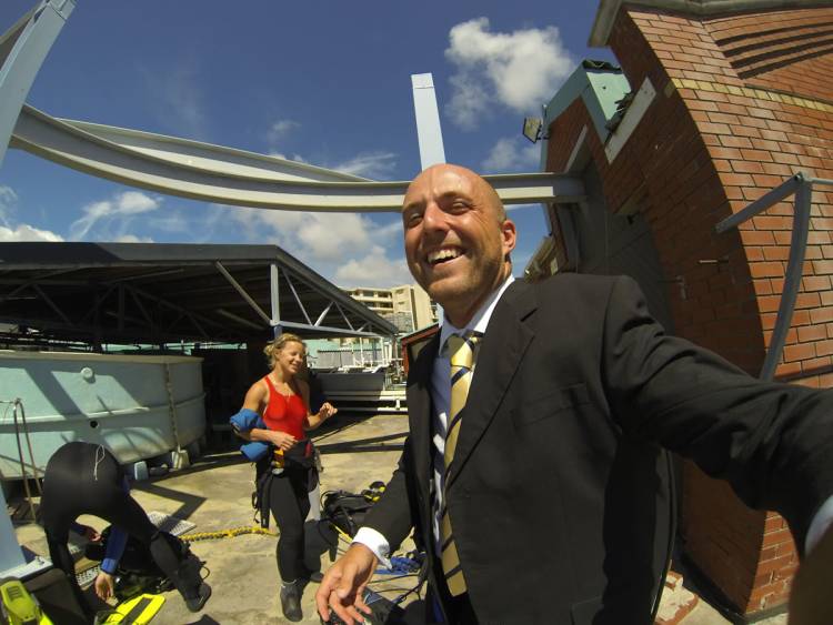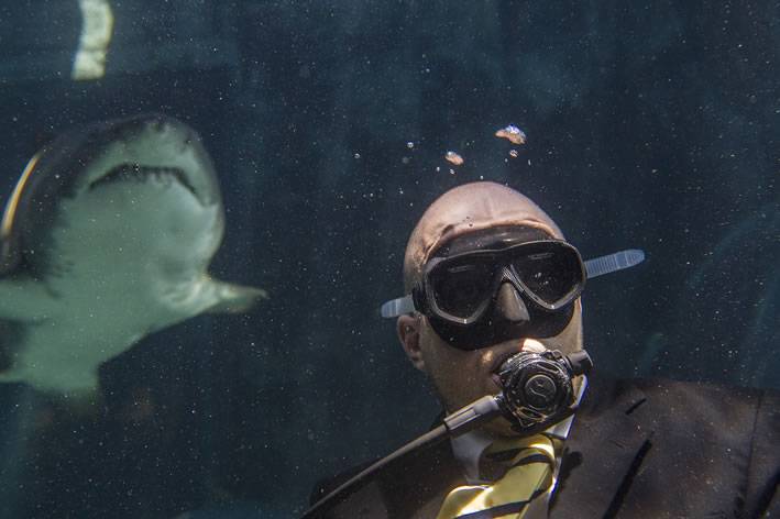 Last week, solo adventurer Ray Chaplin arrived at the Two Oceans Aquarium, donned his wetsuit … and then donned his business suit, for a dive in the I&J Predator Exhibit.
