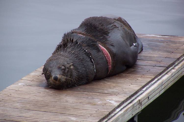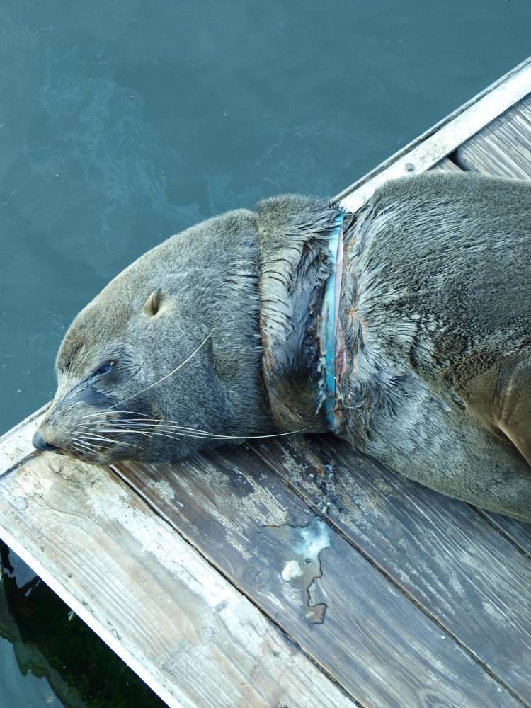 Many of the seals in the harbour have straps or nooses cutting into their necks. If left unattended, the nooses get tighter and cut deeper into the flesh, causing nasty wounds that could lead to the death of the animal. These injuries are caused by the seals swimming into items such as fishing line, bait box bands, rope and raffia cord, which find their way into the water as a result of human negligence.