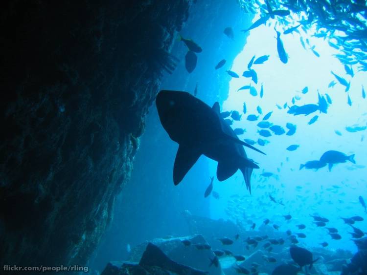 Ragged-tooth sharks are nocturnal hunters. During the day they rest in sheltered rocky shallows, but at night they move into the open, staying low and often travelling long distances from their resting spots. Although usually solitary, ragged-tooth sharks will often congregate and work together to hunt schools of fish. Overall, the cautious lifestyle of the ragged-tooth shark makes it an excellent nocturnal predator that can thrive in water inhabited by competing large shark species.