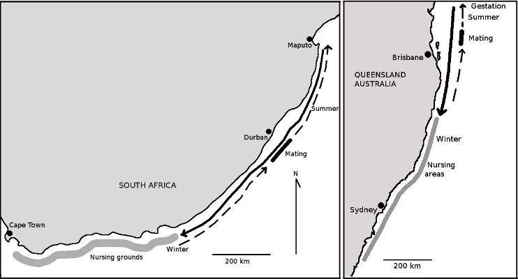 In South African waters, ragged-tooth sharks migrate, a behaviour that they don't exhibit anywhere else in the world. During the summer months, mature ragged-tooth sharks congregate around reefs on the KwaZulu-Natal and Eastern Cape coasts, to mate. Pregnant females then continue north into warmer waters, sometimes heading as far as the Mozambiquan coastline. After remaining in these warm waters for their gestation period, the pregnant females head south, past the Great Kei River in the Eastern Cape to give birth. Juvenile ragged-tooth sharks then tend to remain in these cooler, southern waters towards the Western Cape, where they can mature without competing with the older, larger ragged-tooth sharks.
