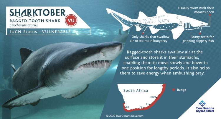 All the ragged-tooth sharks housed in the Two Oceans Aquarium, including the large specimens seen in the Save Our Seas Foundation Shark Exhibit, are, in fact, juveniles and in most cases are actually females. After spending a few months or years at the Aquarium, these sharks are returned to the wild, usually in the vicinity of Buffels Bay on the Garden Route, with care being taken to do so at the time of year when ragged-tooth sharks of a similar age and size are in that area too.