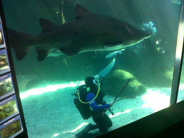 While wandering past the I&J Predator Exhibit at approximately 7.30am, I happened to notice a predator feed taking place. Now, obviously, in 18 years I’ve been to many predator feeds. The difference with this one, though, was that I was the only person watching. I felt so special having this experience all to myself. It’s one of the many perks of working at the Aquarium.