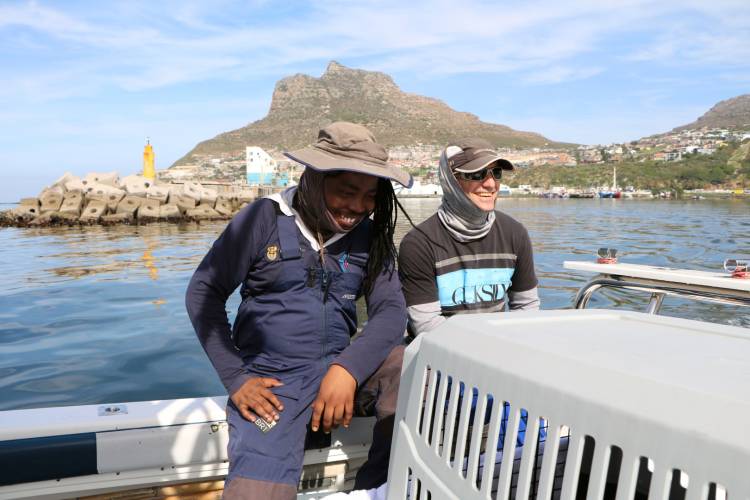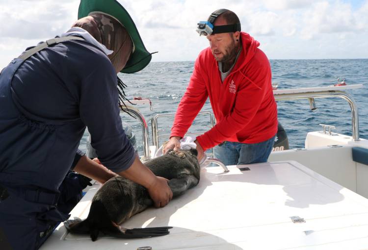 Daisy remained at the Aquarium overnight for observation, and on Friday a combined team from DEFF, the Two Oceans Aquarium Education Foundation (which runs a number of animal welfare programmes, including the management of seals and other wildlife within the V&A Waterfront) and Two Oceans Aquarium transported her to Hout Bay. Here, we met with Barry Stringer of Reef Wetsuits (the long-time sponsor of much of the Aquarium's diving equipment) and skipper of the Devocean who offered the use of his boat to take Daisy out a safe distance to be released.