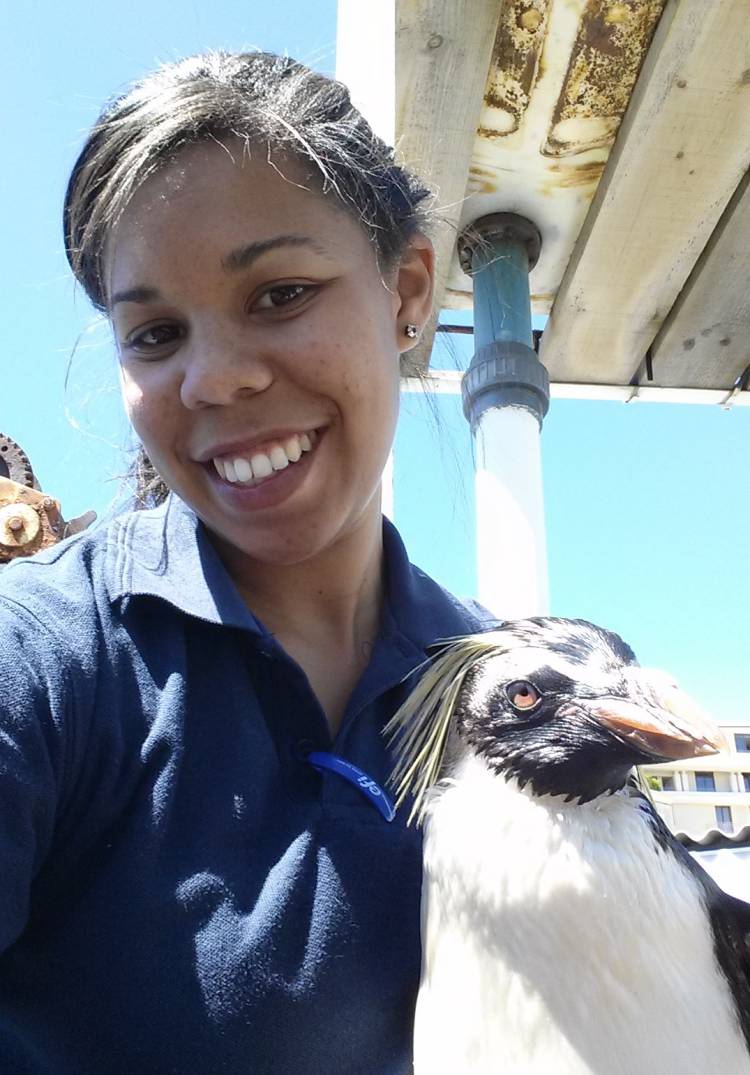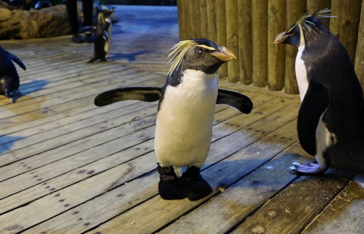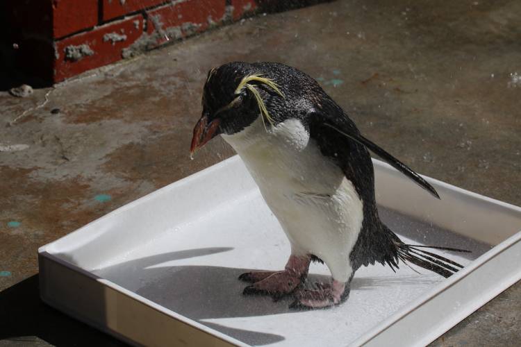 Teddy is not a morning penguin at all! He stays very grumpy until he sees the swimming pool. He enjoys swimming under the waterfall, and he is the only rockhopper that enjoys being washed off after a saltwater swim. Teddy definitely knows how to #savelikeapenguin, even drinking water in the shower!
