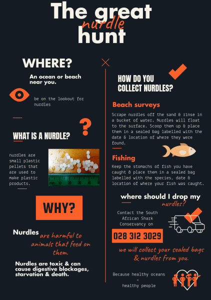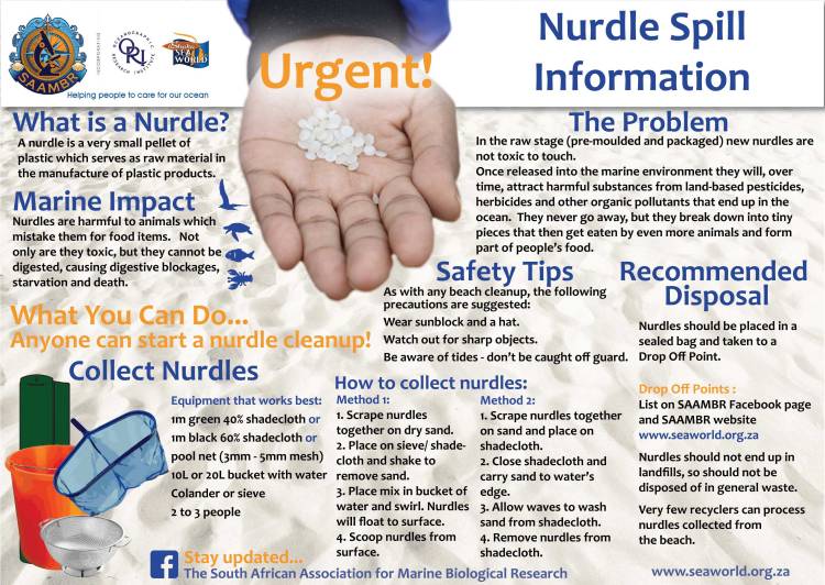 The South African Association for Marine Biological Research (SAAMBR) has sent out an urgent appeal for beach users along the entire South African coast to try and assist in collecting as many of these nurdles as possible. This is important not only to try to minimise the damage caused, but also to assist SAAMBR with essential microplastic research. They will be running a project over the next month to assess nurdle distribution on the beach and will be studying the stomach samples from local fishes to determine if nurdles are being ingested.