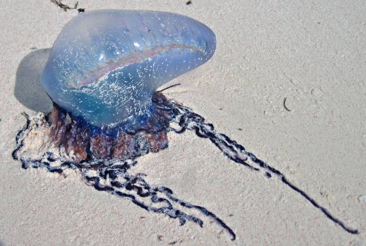 A common sight on the beaches of South Africa is stranded blue bottles, which are incorrectly referred to as jellies. Bluebottles and Portuguese man-of-war are not true jellies, although they belong to a related group (the Cnidaria). The Portuguese man-of-war is so named as the early English sailors (circa 1400) thought it looked similar to a caravel, a small ship used by the Portuguese to explore the seas.