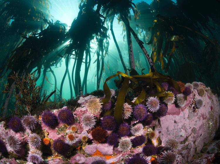 Sea urchins and rock lobsters are some of the animals that feed and take cover amongst the root-like holdfasts of the kelp. Cape sea urchins live in vast numbers on shallow reefs where they graze on kelp and algal debris. They provide important nurseries for abalone (perlemoen) – the spines of the urchins protect juvenile abalone from predators such as octopus, klipfish and rock lobsters.