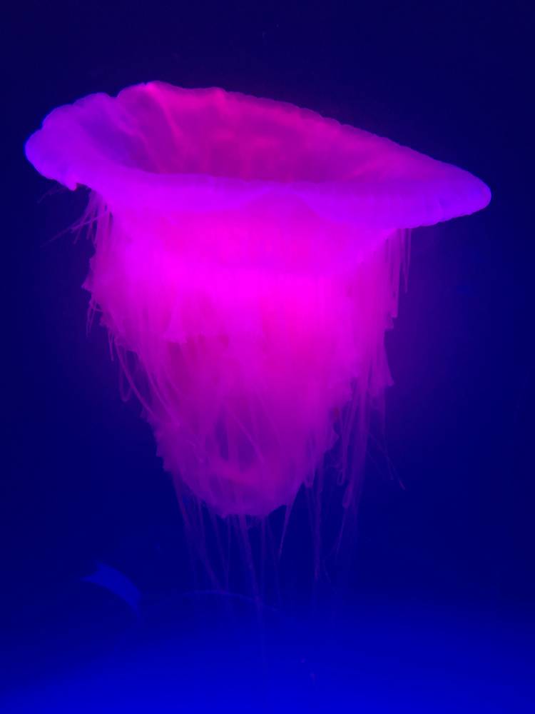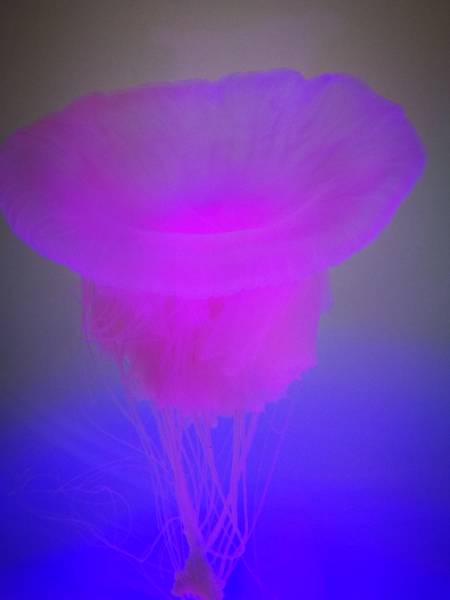 Pink meanies are jellyvorous, meaning they feed on other jelly species by reeling them in with their long tentacles. It is considered the most efficient jellyvorous jelly, as it can digest its prey within two to three hours. Its Mexican cousins have been seen consuming up to 34 other jellies at once. Needless to say, our specimen made quick work of all the compass jellies it was accidentally placed with.