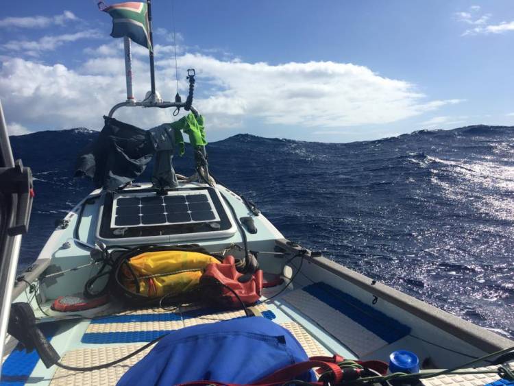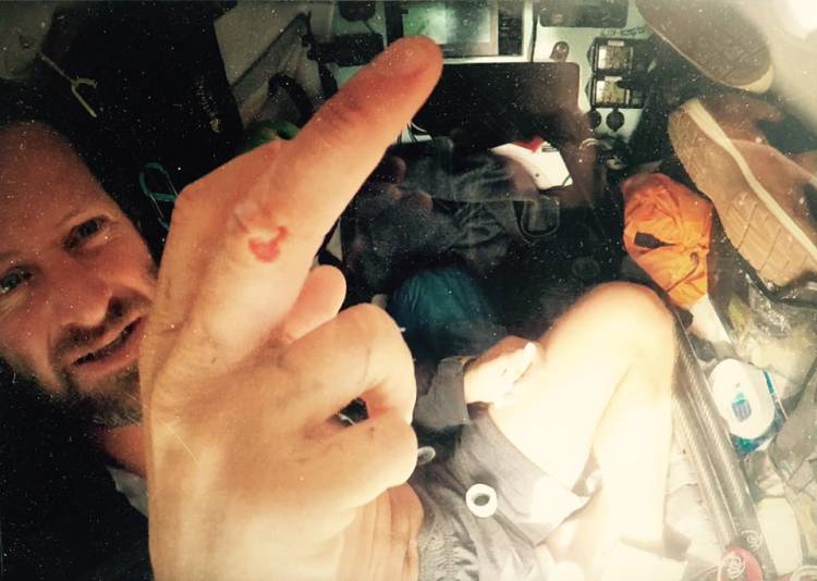 So far, I've been knocked flat in my craft probably 15 to 18 times by waves in the night and day, been semi-inverted twice, full inverted once… I've been knocked overboard by waves once and dragged by my safety harness underwater in all my gear. I almost had my finger ripped off once, I'm still nursing the two big lacerationsto my finger daily, as it's wet all the time, so it battles to heal. My autopilot failed which I had to re-calibrate twice and the water maker stopped working, which I got working after bleeding the system a couple of times. My main steering system snapped and I have had to jury rig two of my own systems before I figured out a new system that actually works pretty good.