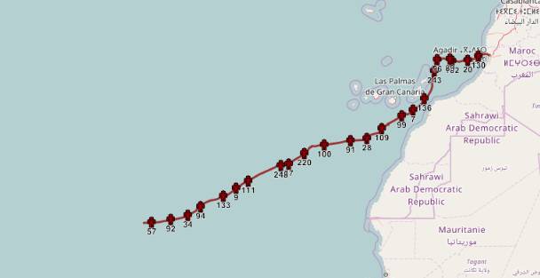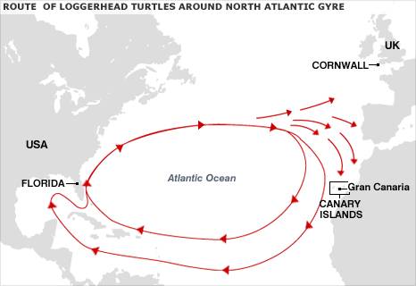 Loggerhead turtles breed on the beaches of northern KwaZulu-Natal and Mozambique, the Mediterranean, West Africa, Brazil and along the south-east coasts of the USA. Florida (Chris’s final destination) has the largest loggerhead population. Every year, loggerhead hatchlings travel from their nesting beaches in Florida, USA to the Mediterranean by way of the warm Gulf Stream. Then they spend four to six years along the Spanish coast and surrounds before heading back in the North Atlantic Current – the same route Chris is taking.
