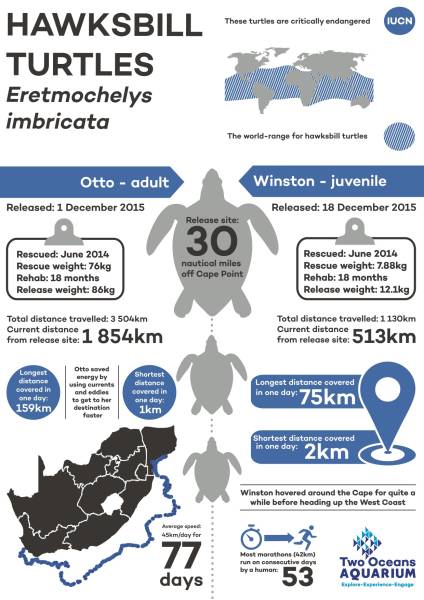 We’ve been able to follow the journeys of our two rehabilitated hawksbill turtles since their releases in December. The Department of Environmental Affairs’ Oceans and Coasts unit helped us fit satellite tags onto the turtles.