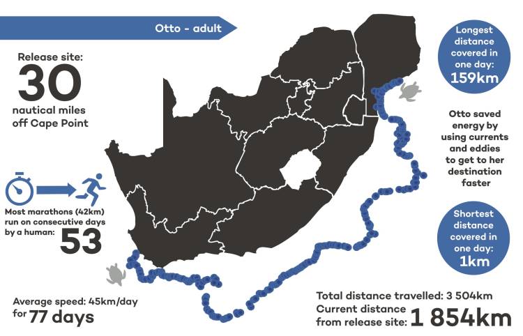 Our very famous Otto was released 30 nautical miles off Cape Point on 1 December. She immediately headed east, swimming alongside the Agulhas Current, which she subsequently crossed on 18 December. By early January she reached East London.