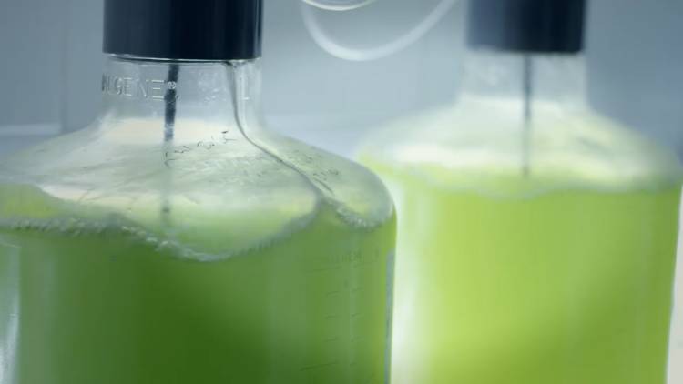 Michelle says: "To feed the rotifers I make 'green water' , which is a colony of Nannochloropsis, which I source from overseas to make sure it is a pure, uncontaminated culture. It looks like a paste, but this is actually a live plant that can grow. We grow these in glass jars in the 'green lab', a temperature- and light-controlled environment."
