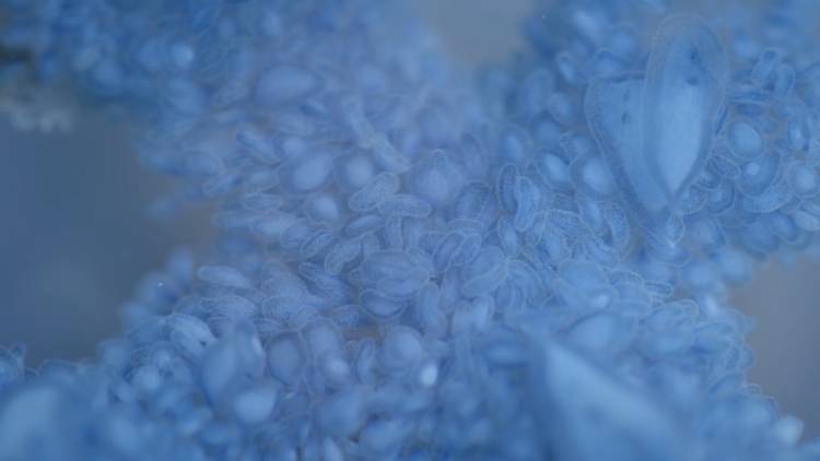 Krish: When a new species comes in we check if we have adult males and females by removing a small piece of their gonads. We look at this piece under the microscope to see if it has sperm or eggs, if it's male or female. We then mix the eggs and sperm together and let that brood for a few hours until we have planulae. When we have planulae, we transfer them to a glass container with filtered seawater and try to get them to settle on plates to form polyps. Once we have the polyps, we technically have that species of jellyfish at the Aquarium forever. When we have these polyps it takes a few months for us to figure out how to get them to strobilate efficiently, producing many ephyrae. And then it takes a few more months to figure out the ideal conditions for that jellyfish to grow.