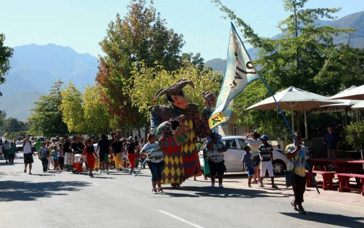 An attention-grabbing, much-larger-than-life puppet was paraded through the centre of Greyton to announce the start of the celebration. This brightly coloured, and beautifully made, marionette and followers were entranced by rhythmic drummers – our African version of pied pipers no doubt – all the way to the festival site.