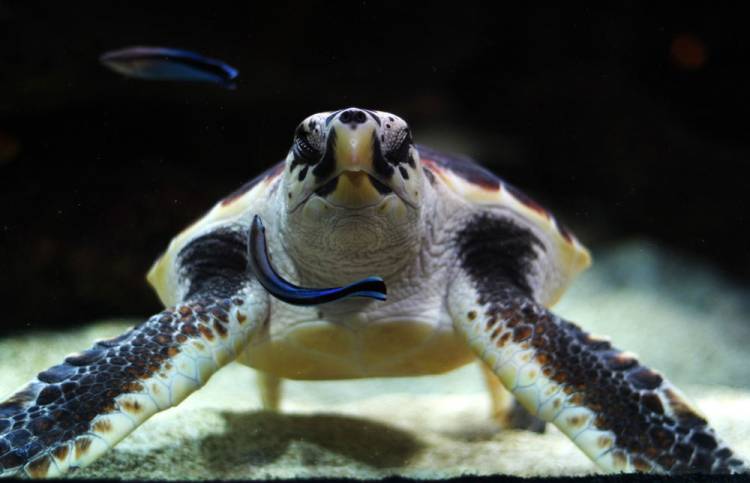 The loggerhead turtle (Caretta caretta) and the bluestreak cleaner wrasse (Labroides dimidiatus) at the Two Oceans Aquarium came together recently for a “photo shoot” – well, not really, but these photos do show the wrasse hovering around the loggerhead, presumably doing some natural cleaning. According to Aquarium staff, this is rarely seen!