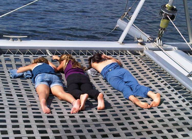 The children were very excited to find that the Tigress boasted an unusual viewpoint. You could sit or lie on what looks like a weaved trampoline, and peek below the catamaran as it glided over the water.