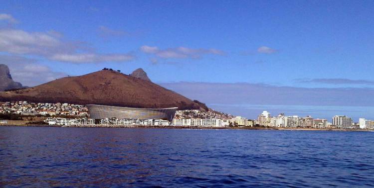 Cape Town Stadium stands out between the bright, blue sky and the ocean water.