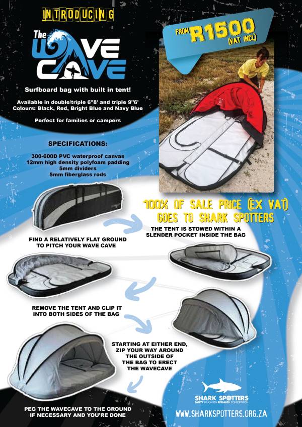 The Wave Cave is an awesome surfboard bag that has a built-in UV resistant tent. The Wave Cave costs only R1500 - and 100% of the sales price (minus VAT) is donated to Shark Spotters.
