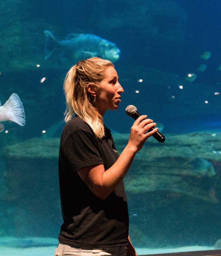 The stage was then taken by Conservation Coordinator Talitha Noble, who wowed the crowd with stories from our turtle rehabilitation facility - the "hidden" gem on the Aquarium's roof where dozens of tiny loggerhead turtle hatchlings are being prepared for their return to the ocean and where large turtles like the immense Yoshi and the ever-loved duo of Bob and Sandy are cared for and prepared for release.