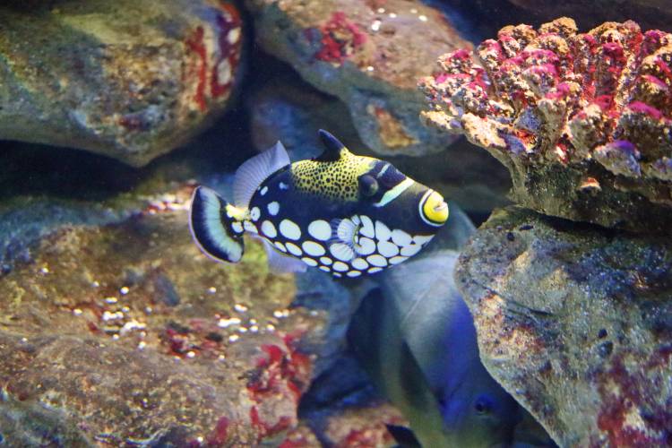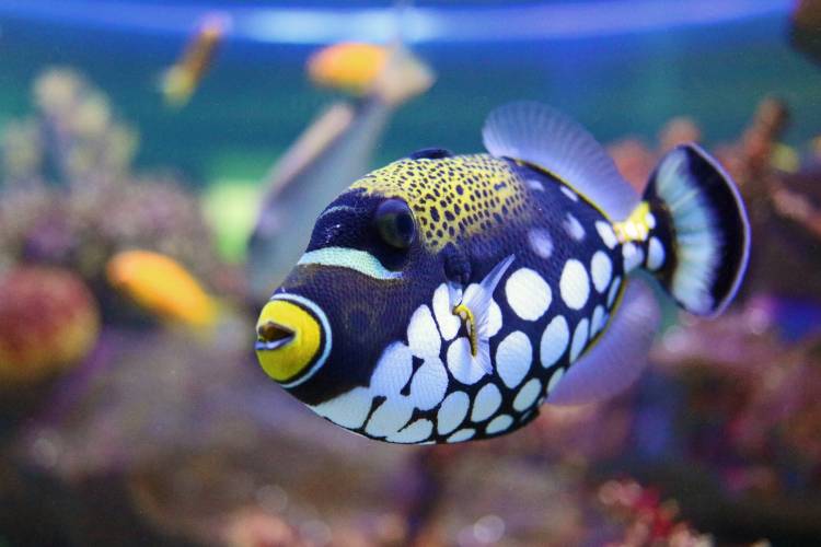 The clown triggerfish (Balistoides conspicillum) comes in with some brightly coloured fish-fashion. Those brightly coloured clown lips just say "kiss me", but don't be fooled - the clown trigger's cute exterior hides a powerful set of teeth which it uses to bite the spines off of sea urchins.