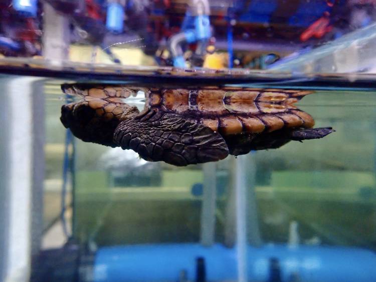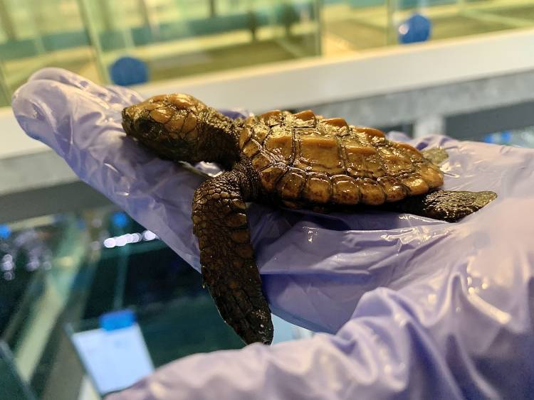 When a turtle arrives at the Aquarium and gets into the hands of the turtle rehabilitation team, the first thing that happens is that it is stabilised. This means that before the team does anything, the little hatchling is placed in a bath of shallow freshwater - shallow enough for it to be able to breathe without lifting its head. This gives the little hatchling a chance to rehydrate and slowly warm up.