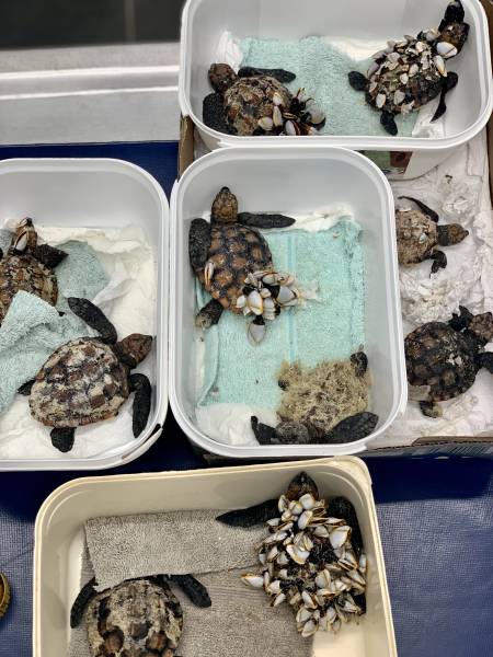 It is then time to remove all the "hitchhikers" that have attached themselves to the turtle's carapace. These are things like barnacles, worms, and algae - these are not necessarily harmful parasites, but they can sometimes hide wounds and they can make it more difficult for a small, weak turtle to swim about. This "ectobiome" is also used for studies!