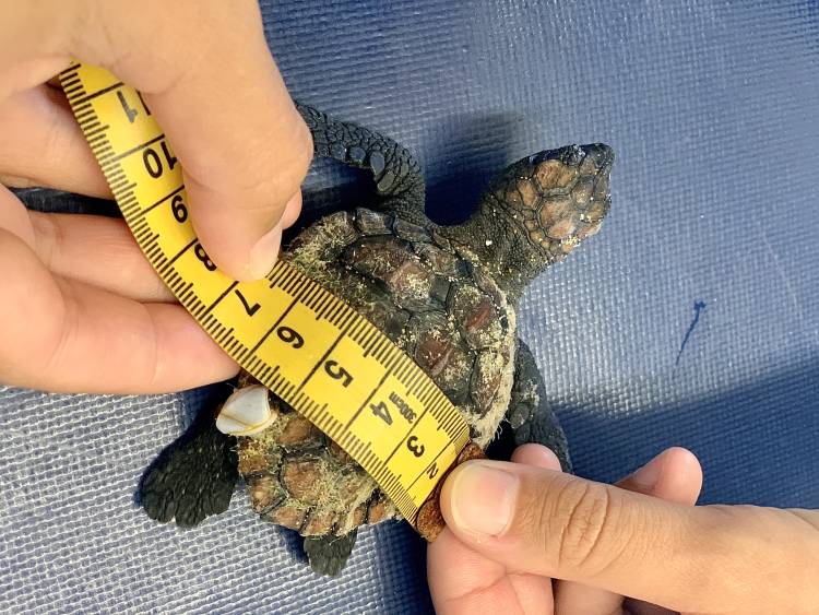 The first step is to take all the turtle's measurements - weight, size, etc. These data help us and the research community learn more about the turtle hatching season, and the growth rate of our local turtles.
