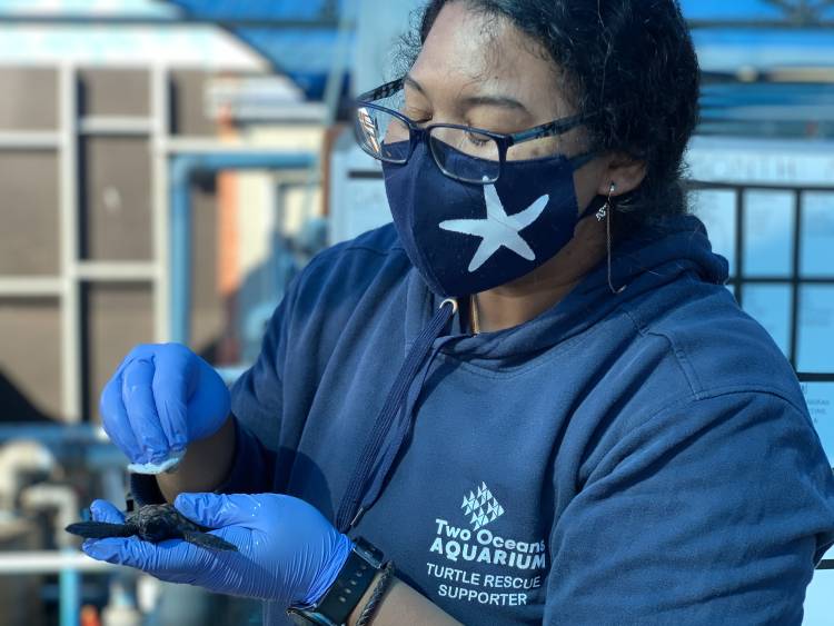 Once the turtle starts showing movement and a bit more spunk, the team begins to offer it food. If a turtle has a strong appetite, it's usually a good sign!