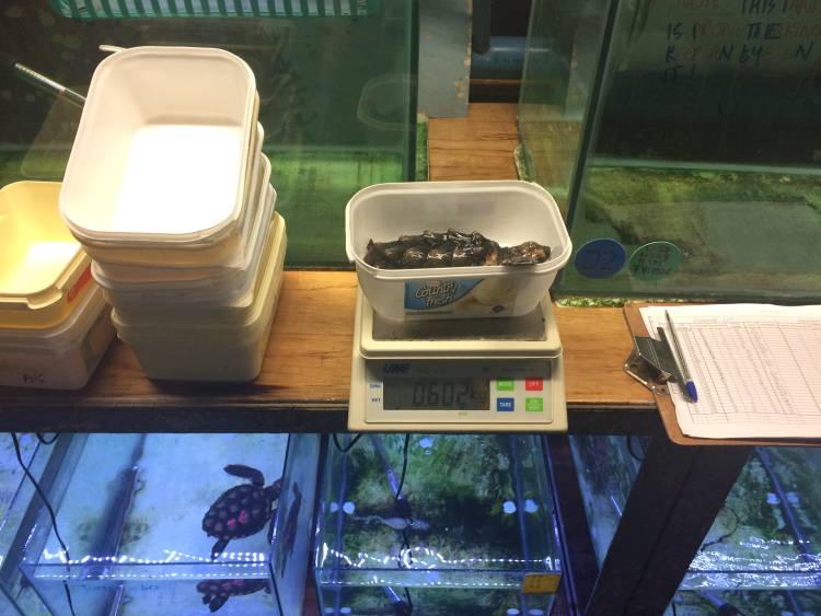 We weigh the turtles regularly to ensure that they are growing properly. We also do regular medical check-ups to ensure that they are all healthy. A large part of the day is spent cleaning, not very glamourous, but very important, to ensure that the holding tanks are always sterile and sparkly, and that no infections or germs can spread.