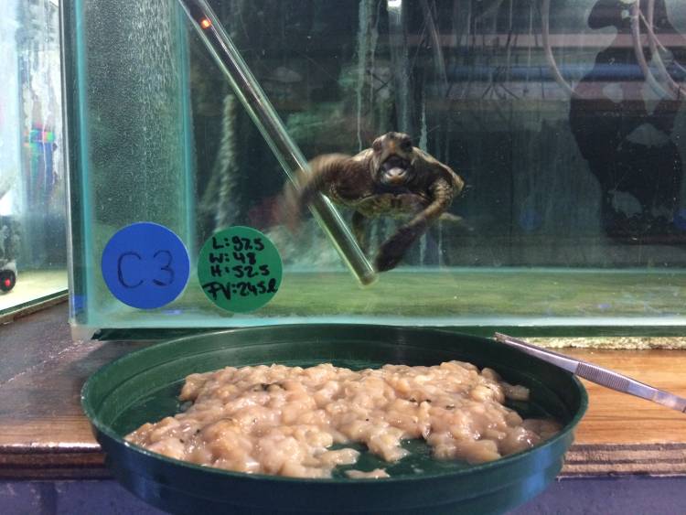 Then it’s breakfast time! Their food is prepped in the food prep kitchen and the menu changes regularly. A few times a week the turtles are served a gel food filled with all the good vitamins. On other days they enjoy white mussel, squid and pilchard. The turtles get so excited when breakfast comes around, many try and bite at the food through the glass or splash water everywhere with their flapping flippers. Some are quite uncoordinated and miss their food entirely. But they all get there in the end, even if it means that I have to help a bit.