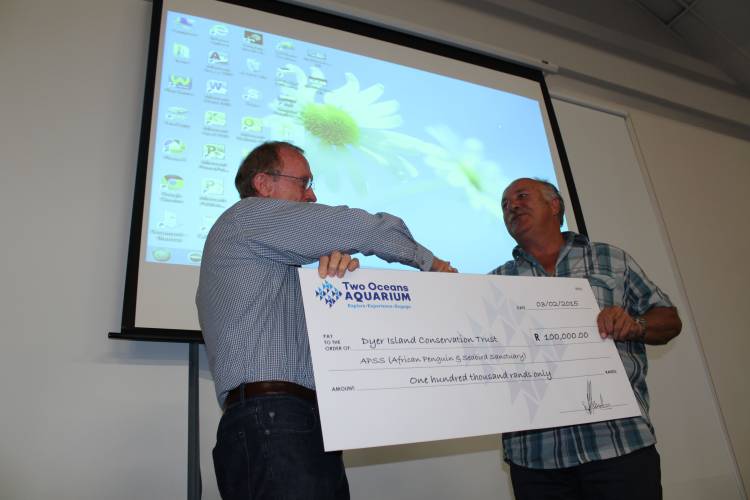 On 3 February 2015, the Dyer Island Conservation Trust (DICT) launched its African Penguin and Seabird Sanctuary (APSS) during a function hosted at the Two Oceans Aquarium. As part of the evening’s proceedings, Dr Pat Garratt, CEO of the Two Oceans Aquarium, presented the DICT with a donation of R100 000 towards the project.