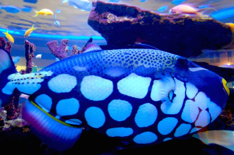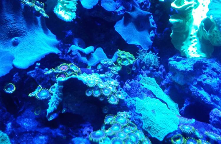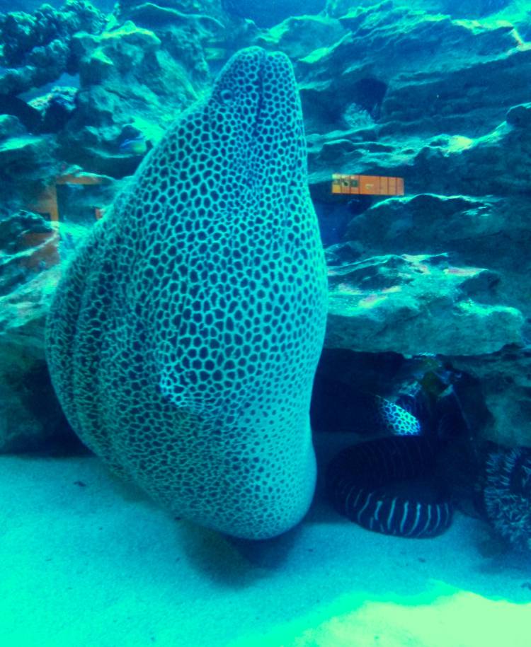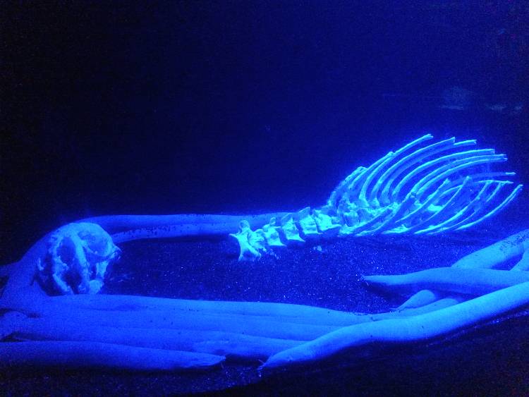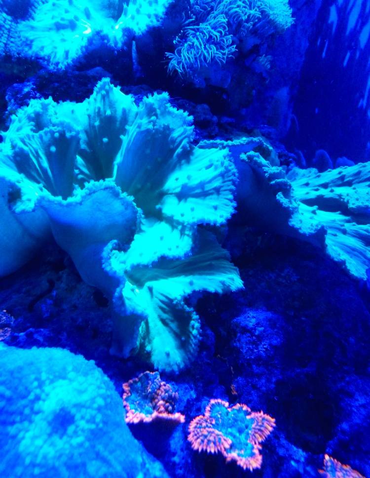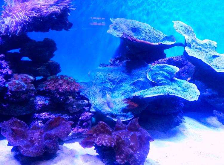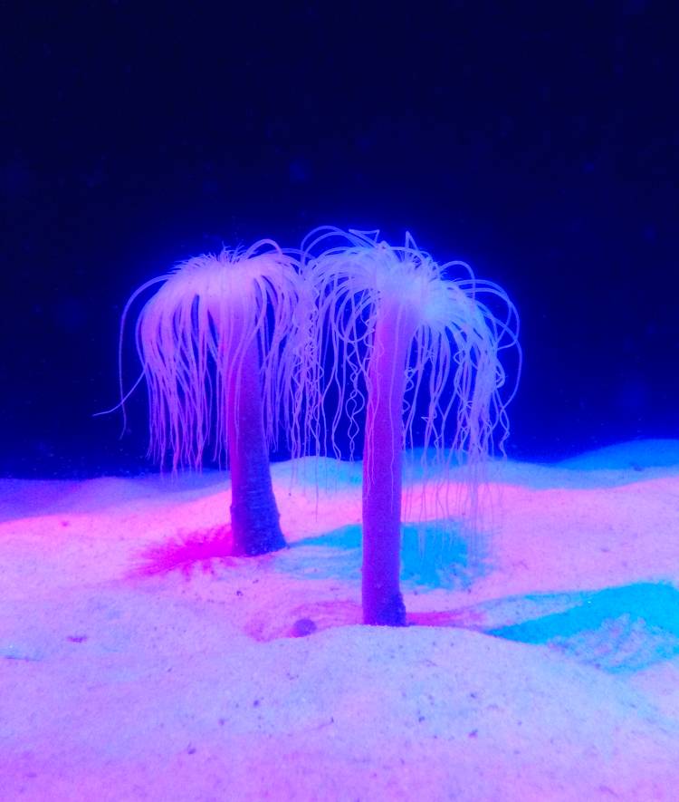 Neon colours highlight certain of the aquarium’s exhibits – especially those featuring crayfish, hagfish, anemones, giant clams and coral. The fluorescence is sometimes a display of pigmentation and colouring, sometimes enhanced by neon light, and other times it is an indication of biofluorescence, a natural phenomenon among around certain deep-sea species.