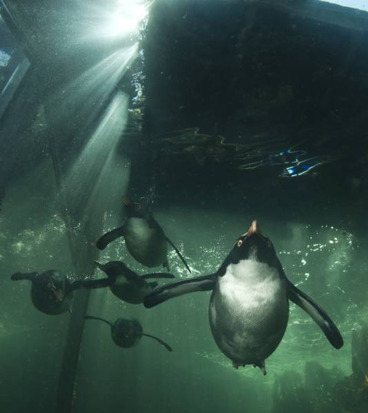 By watching the behaviour of the free-swimming penguins in the exhibit, I positioned myself so they would swim close to the camera themselves. It is never a good idea to chase after wildlife underwater.