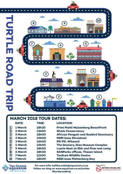 At each of the 10 stops, you can join the turtle conservation team for a short presentation about what YOU can do to help sea turtles as well as the work being done at the Two Oceans Aquarium to help stranded hatchlings. We'll discuss how you can help save stranded turtles that you might encounter, and what you can do to help them out on the other 364 days of the year as well. Be part of the sea turtle loving network!