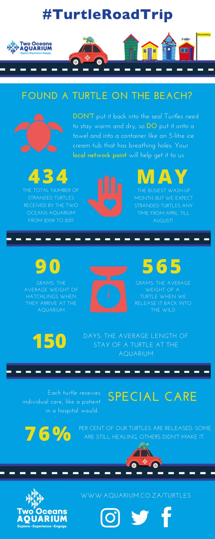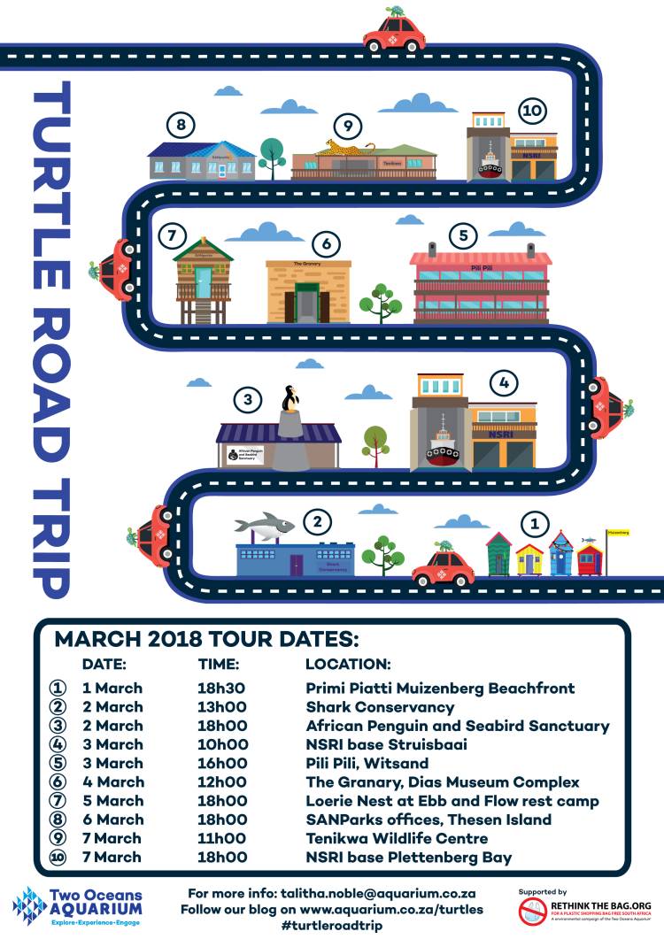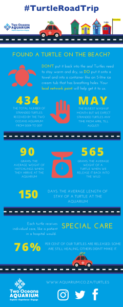 The Two Oceans Aquarium conservation team has a plan: To undertake a "Turtle Road Trip" to visit the locals and communities , from Muizenberg to Plettenberg Bay, most likely to find these stranded turtles, to educate them and equip their communities with network points that are able to care for these hatchlings and to transport them to the Aquarium's turtle rescue, rehab and release centre.