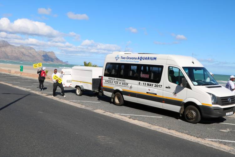 After our emotional afternoon of Day 4, ending at the Stony Point African penguin colony, it was time for the Waddle to move a bit closer to Cape Town. From Betty's Bay, the waddlers travelled to Gordon's Bay in our Waddle Wagon (proudly sponsored by De Kat Safaris and branded for the Waddle by XXL Brand Solutions). It was sad to leave behind the Whale Coast, its beautiful views and adorable wild penguins, but we knew it was time to take our Penguin Promises message into False Bay, and closer to our final destination.