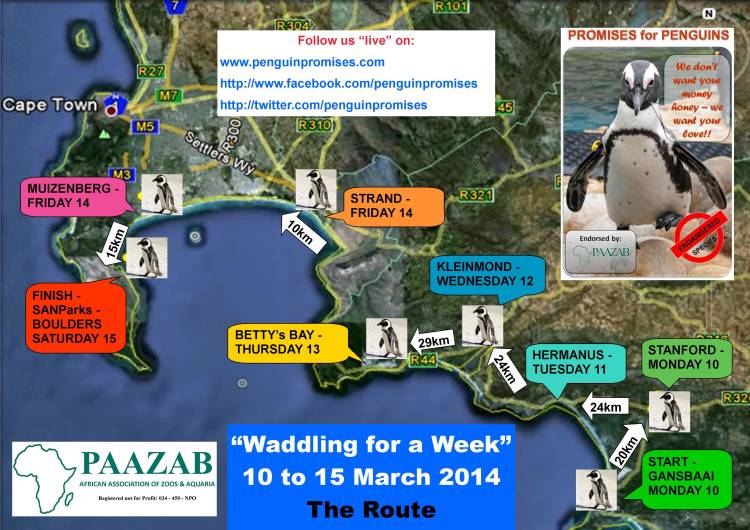 Waddles 2012 & 2013 received much-needed and appreciated sponsorship from both Cape Nature and Chrysler Jeep Dodge. Accommodation at each night’s stop was kindly sponsored, and the Dyer Island Conservation Trust has been most supportive of the campaign since its inception. Old Mutual Finance have generously stepped forward as headline sponsors to fund Waddle 2014. Penguin Promises also benefits from the endorsement of the African Association of Zoos and Aquaria (PAAZAB), and the campaign was awarded the 2013 PAAZAB Conservation Award.