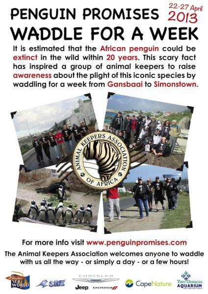 The 2013 Penguin Promises Waddle for a Week will take place from 22 to 27 April 2013. This is the third year that a group of intrepid Waddlers will be setting off from Gansbaai and making their way to Simon’s Town, raising much-needed awareness about the plight of the endangered African penguin.