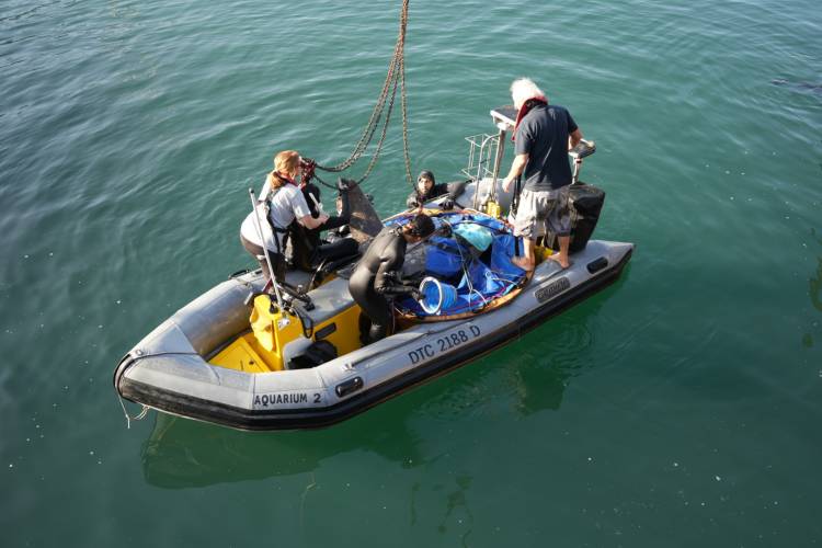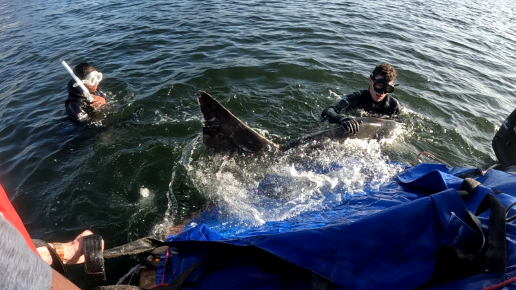 Once the team had collected the necessary data the sunfish was hoisted by Tandem Cranes out of the dock and across to the waiting boat skippered by Claire and Vincent. “During the boat ride, we scooped buckets of water to pour onto the mouth of the sunfish and monitored its breathing. Once we were safely out of the harbour we jumped into the water and released the sunfish. We held on to it for a few minutes to check its breathing. Once it regained strength we all let go and it swam off strongly,” said Calley.