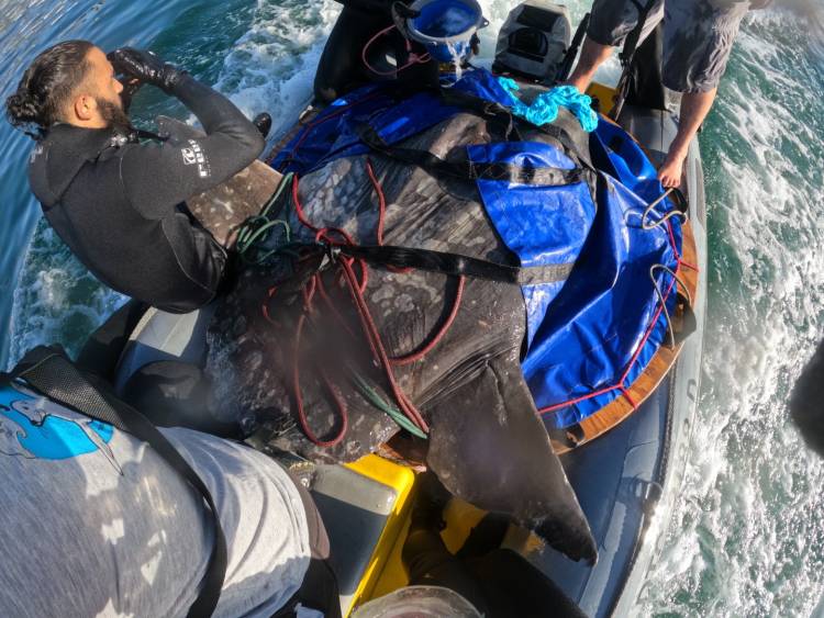 The rescue team, comprising of Claire, Brett, Nathalie, Calley, retired ex-staff member Vincent Calder, aquarists Ayrton King and Daniel Seldon, and Educator Kirshia Govender, sprang into action as soon as the water was low enough for them to stand in the dry dock. “The distressed sunfish was quite weak, so it was fairly easy to flip it on its side to load it onto the stretcher,” said Calley. “Once it was safely secured on the stretcher, we swam it across to the steps of the dry dock where we collected biological measurements.” Together with the stretcher, the sunfish weighed 760kg, and had a total length (TL) of 160cm, a pre-caudal length (PCBL) of 122cm, and a total body depth (TBD) of 189cm. This data is shared with international researchers working on sunfish around the world.