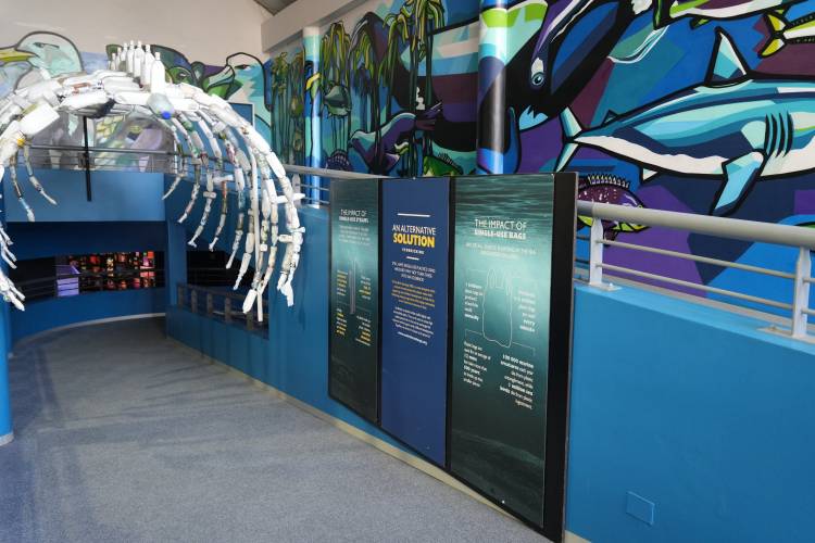 Leaving the I&J Children's Play Centre, you now make your way up the ramp, which by the way, is not just an ordinary ramp. Besides providing amazing photo ops in front of the beautiful mural running along the wall, the ramp wall also provides some very valuable information on plastic pollution. In addition to that, the ramp also contains a whale skeleton made up of eco-bricks, to symbolize the many ways of recycling plastic and keeping it out of our oceans.