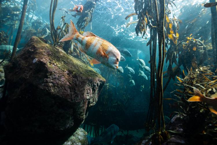 Leaving our Penguin Exhibit, just a few steps away, you'll find our Kelp Forest Exhibit. This is one of our larger exhibits. Not only is this exhibit filled with beautiful kelp, but it is also home to many species of large fish and small sharks. If you're here at the right time, you may spot our rockhopper penguins enjoying a swim in this exhibit.