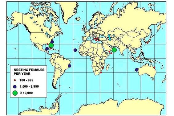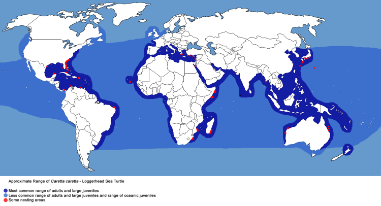 There are loggerhead nesting sites along northern Kwazulu-Natal, Mozambique, Oman, Japan, Australia, Cape Verde, Brazil, North America (Florida) as well as in the Mediterranean (Spain, Greece, Turkey).