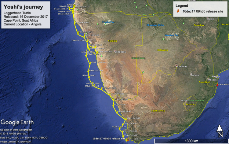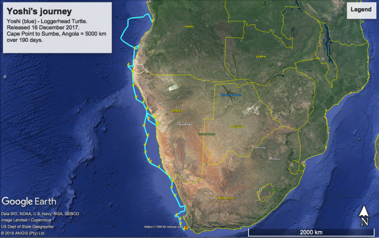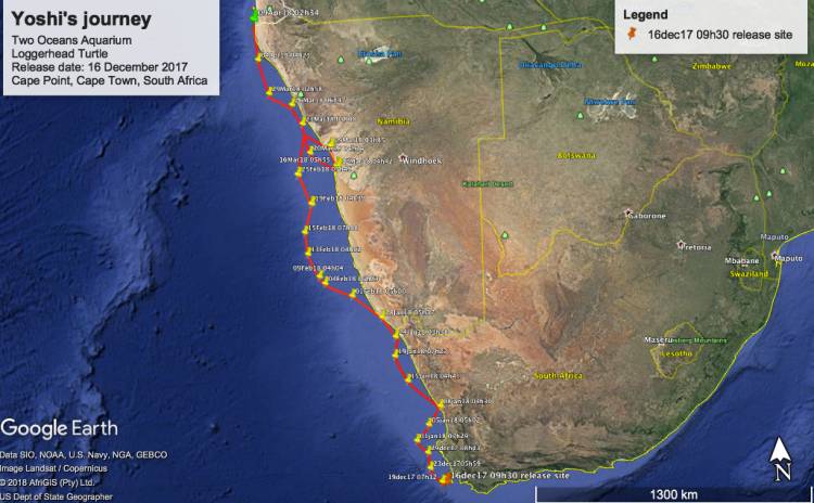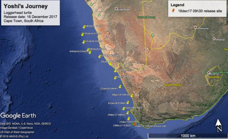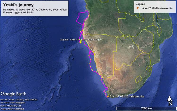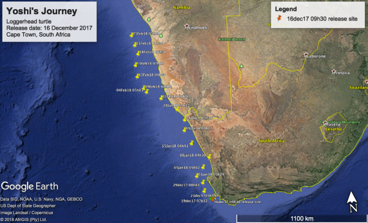 On 16 of December 2017, a satellite tagged Yoshi, together with 26 rehabilitated loggerhead turtle hatchlings, were released about 30 nautical miles off Cape Point into the warm currents of the open ocean.