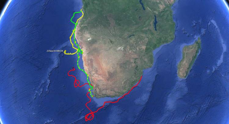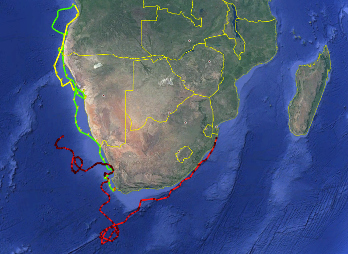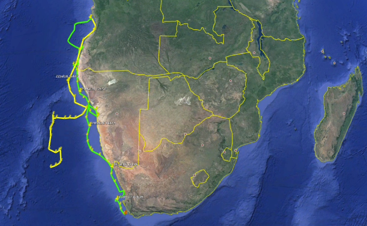 From Cape Town, through Namibia, to Angola and back down past Namibia – what a journey. At her current pace, she might be back in South African waters by November.