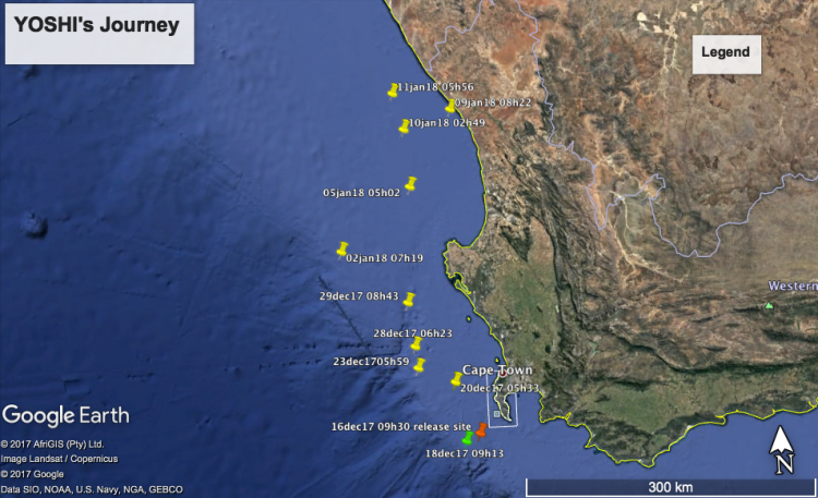 - Yoshi’s straight-line distance from her release site is 963km’s at a heading of 333 degrees (NNW). This basically means that if you were in a boat and used your GPS to direct you on a straight-line at 333°, you would find Yoshi after travelling for 963km’s (which is about 520 nautical miles). She, of course, spent quite a bit of time exploring Cape Town waters and the coastline – with two visits rather close to shore (2km and 6km offshore) - compared to her current 130km offshore position, and that is why her total distance travelled is significantly more than the straight-line distance.
